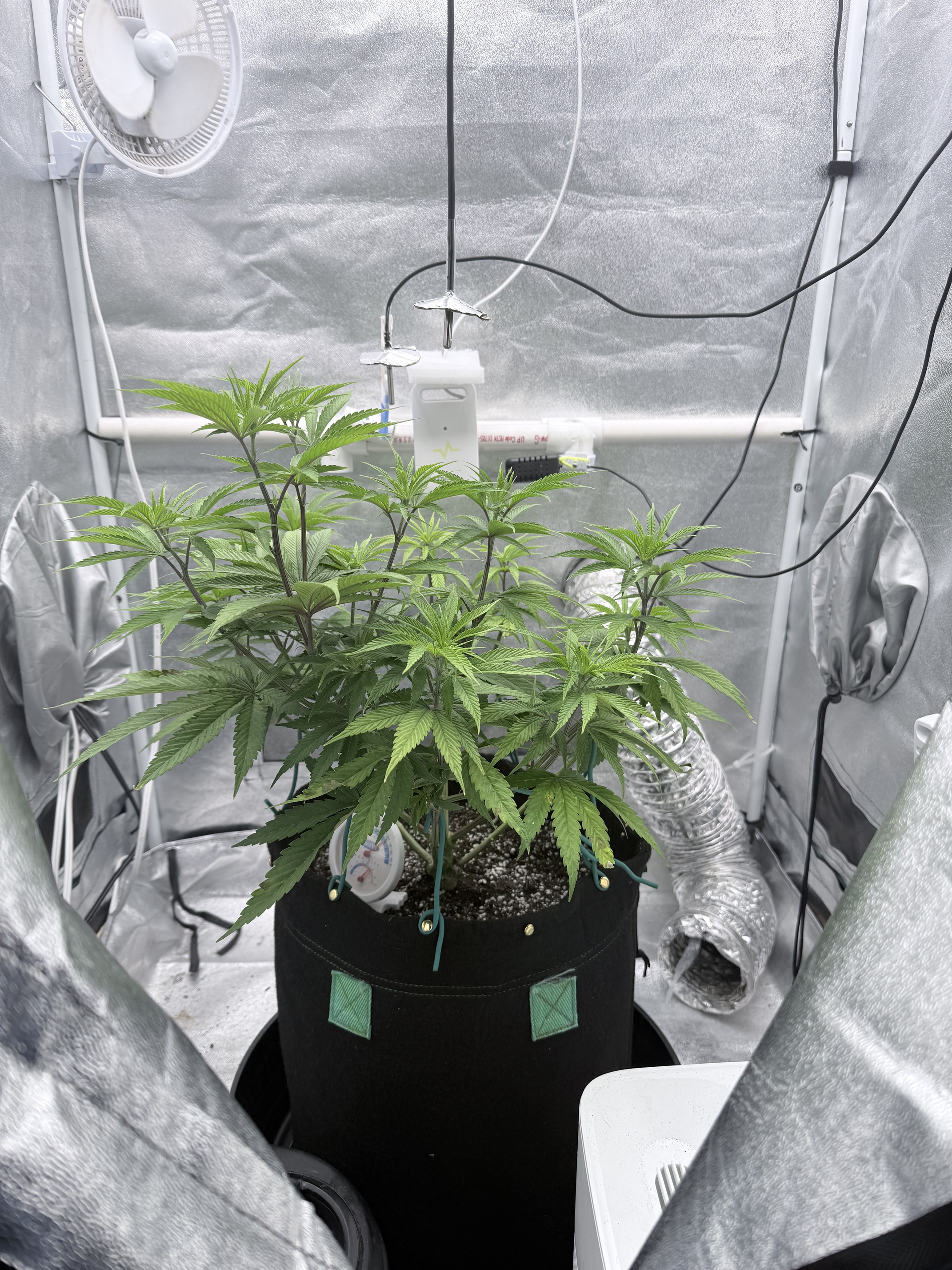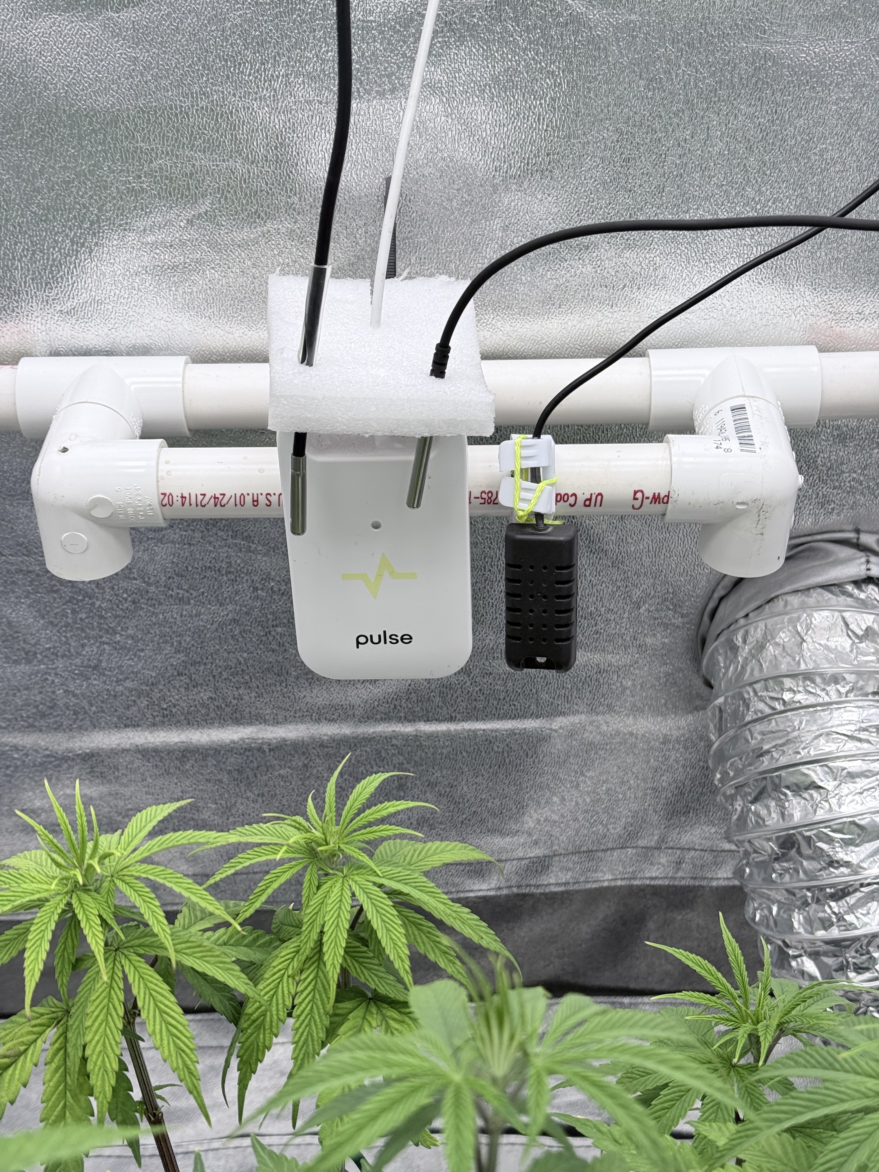 Here is a close up, the 2 probes has been moved. The black rectangle is the IHC-200 humidity controller from Inkbird. It is more like upper-canopy not above the canopy. I know it has to be steady not moving at all to get good readings. Where its at now is giving me good readings. The way it looks in the picture looks like its close to the plant but its 6-8 inches from the plant.